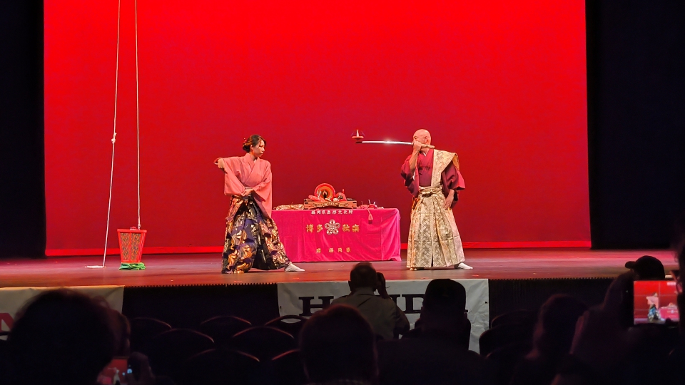 博多独楽さんは、扇子や刀の刃の上で独楽を回す妙技を披露し、観客を魅了しました。さらに「福岡・アトランタ姉妹都市 20 周年おめでとう!」のくす玉が披露され、会場は祝賀ムードに包まれました。