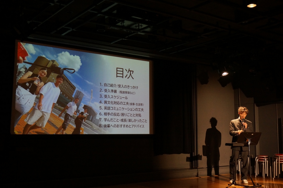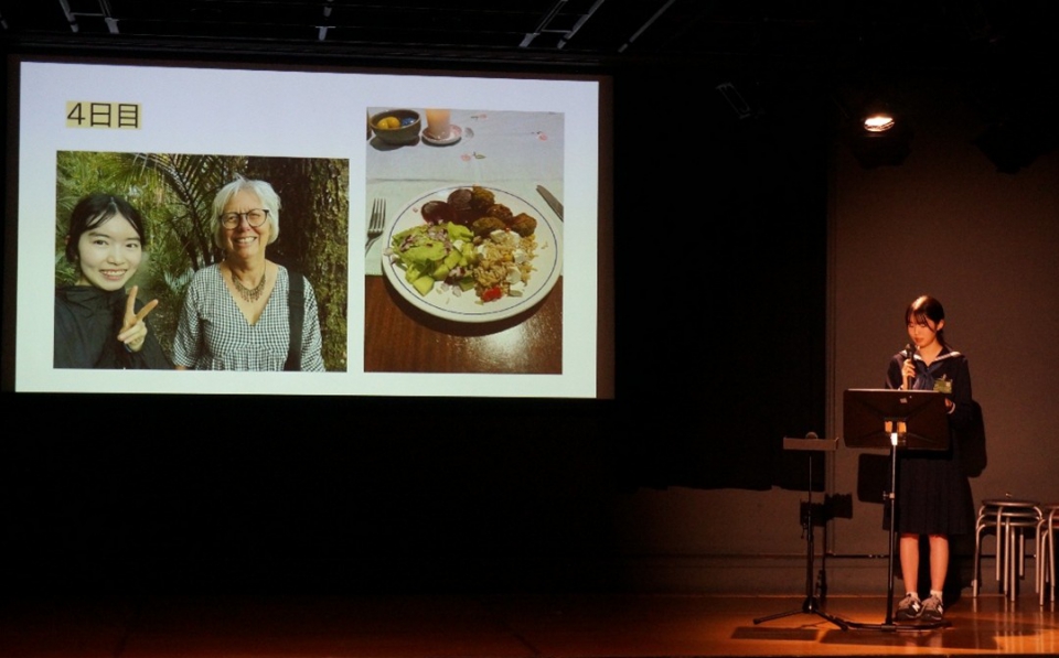 今年、ホストファミリーとしてアメリカ・オークランド市の高校生を受け入れた学生が発表を行いました。英語でのコミュニケーションの難しさや、工夫したことなどを報告してくれました。